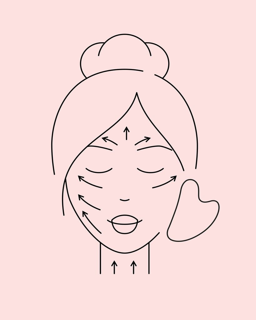 When you see the facial anatomy underneath the skin, like lymphatic glands and muscles, you can see why gua sha tools are so effective when utilised. Before using your gua sha, it helps to apply an oil or hydrating mist (such as our Glow Mist) to ensure it can slide with ease across the skin. We’ve included a facial map with some directional tips for gliding and dancing your gua sha across your face for optimal glowy benefits below.