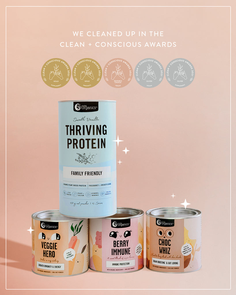 Finally in the Vegan category, coming in with a silver medal + an Editor’s Choice Award, is our Thriving Protein Smooth Vanilla. Thriving Protein Smooth Vanilla is a creamy, plant-based, nourishing protein blend to help every member of the family thrive. Thriving Protein delivers a wholesome boost of protein, calcium, iron, selenium, vitamins C, D, E, folate and other B vitamins, all from organic wholefoods to support optimal health and wellbeing. With sprouted & bio-fermented pea and brown rice proteins combined with prebiotics & 1 billion CFU of probiotics per serve, Thriving Protein supports gut health and is easily digestible, gluten free and vegan.